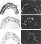 adjacent transverse sections from a stage-20 albino embryo. Panel C shows a section photographed under phase-contrast