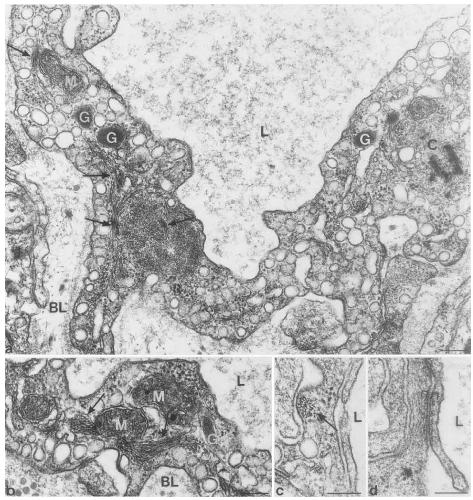 actin microfilaments; BL, basal lamina; A4 mitochondria; C, centriole; L, lumen; C , cytokeratin storage granules; burs, 0.25 um