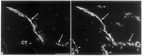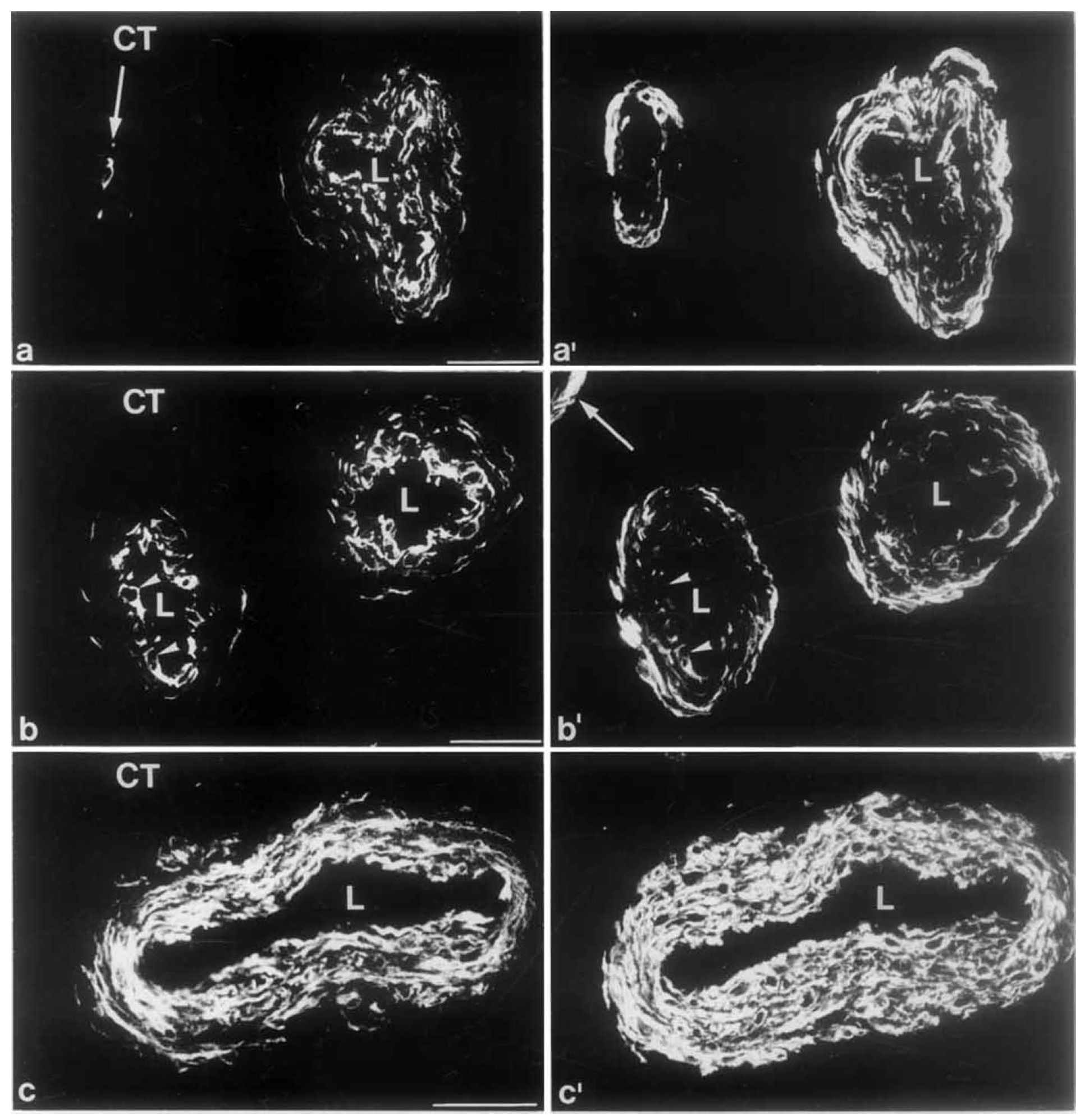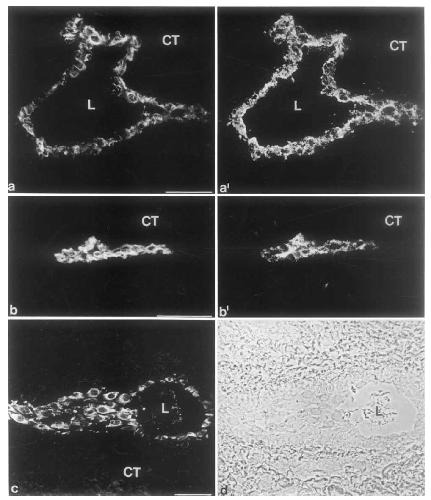 the vascular wall (a, bracket), whereas endothelial cells are negative (b, b’); L, lumen; CT, connective tissue; bars, 50 um