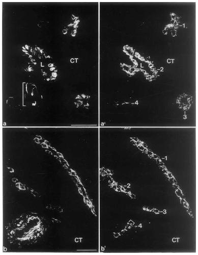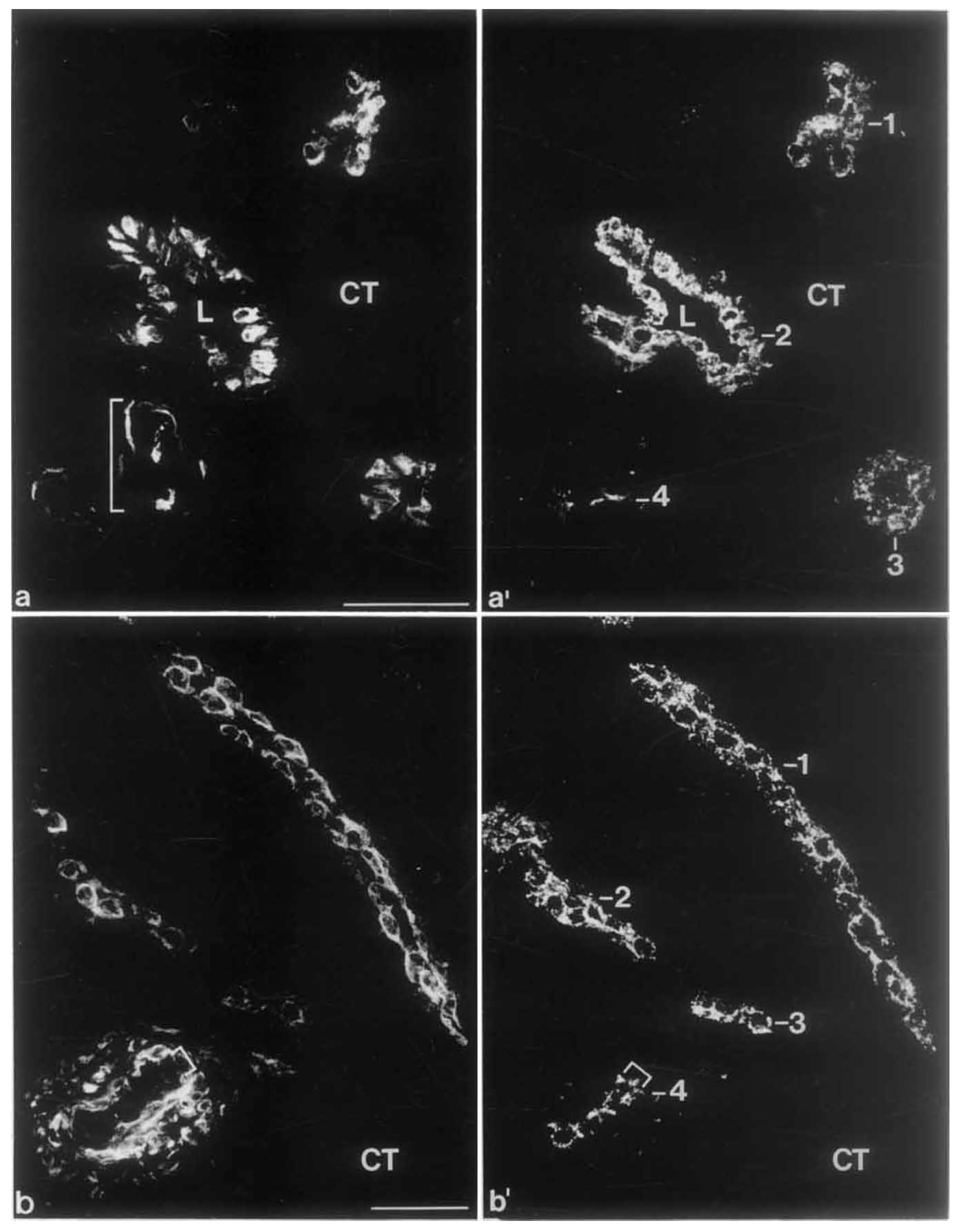 cell tracts positive only for cytokeratin (a) or for desmin (b’): L, lumen: CT, connective tissue; bars, 20 um