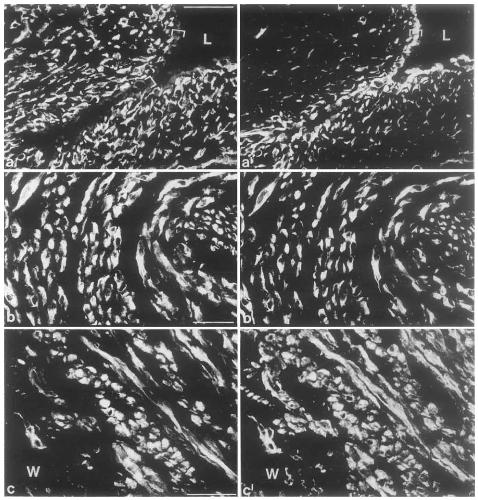 to vimentin (a’, b’) or monoclonal murine antibody to desmin (c’). Note that here endothelial cells (brackets in a and a’; L, lumen)