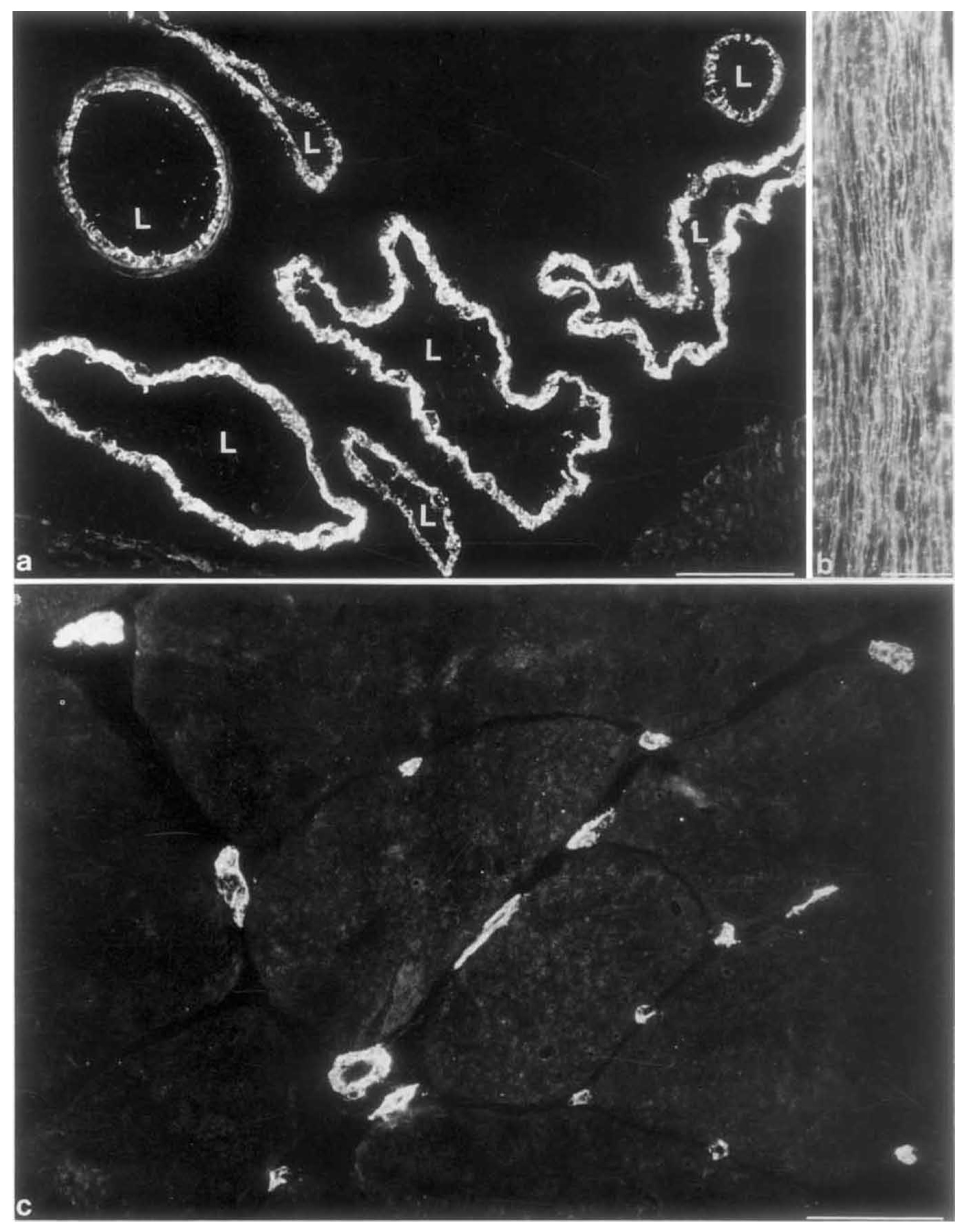 Fig. 2. Immunofluorescence microscopy performed on frozen sections of esophageal submucosa (a, b) and skeletal muscle (c) from