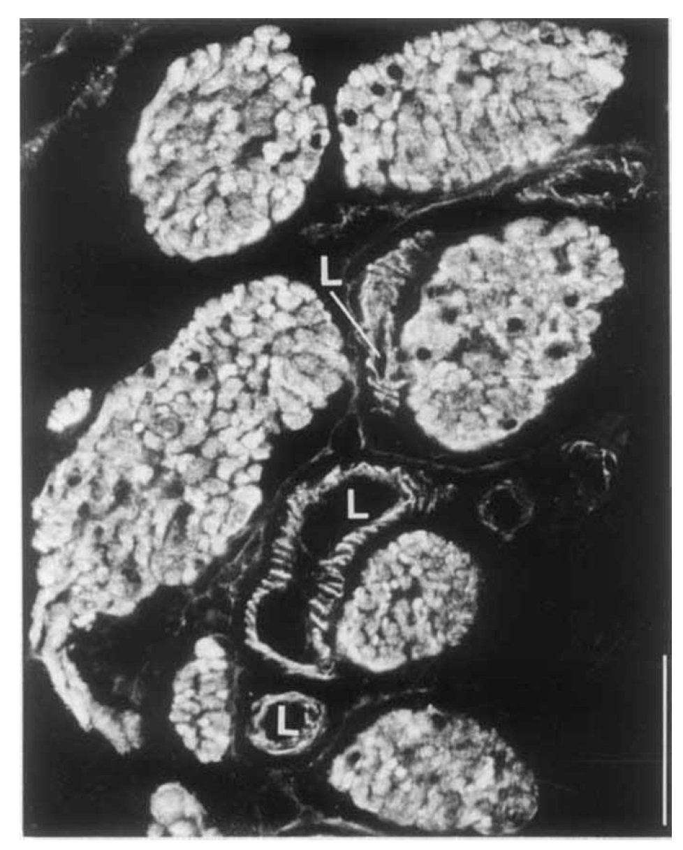 blood vessels (L, lumina) are brightly stained; bar, 50 um