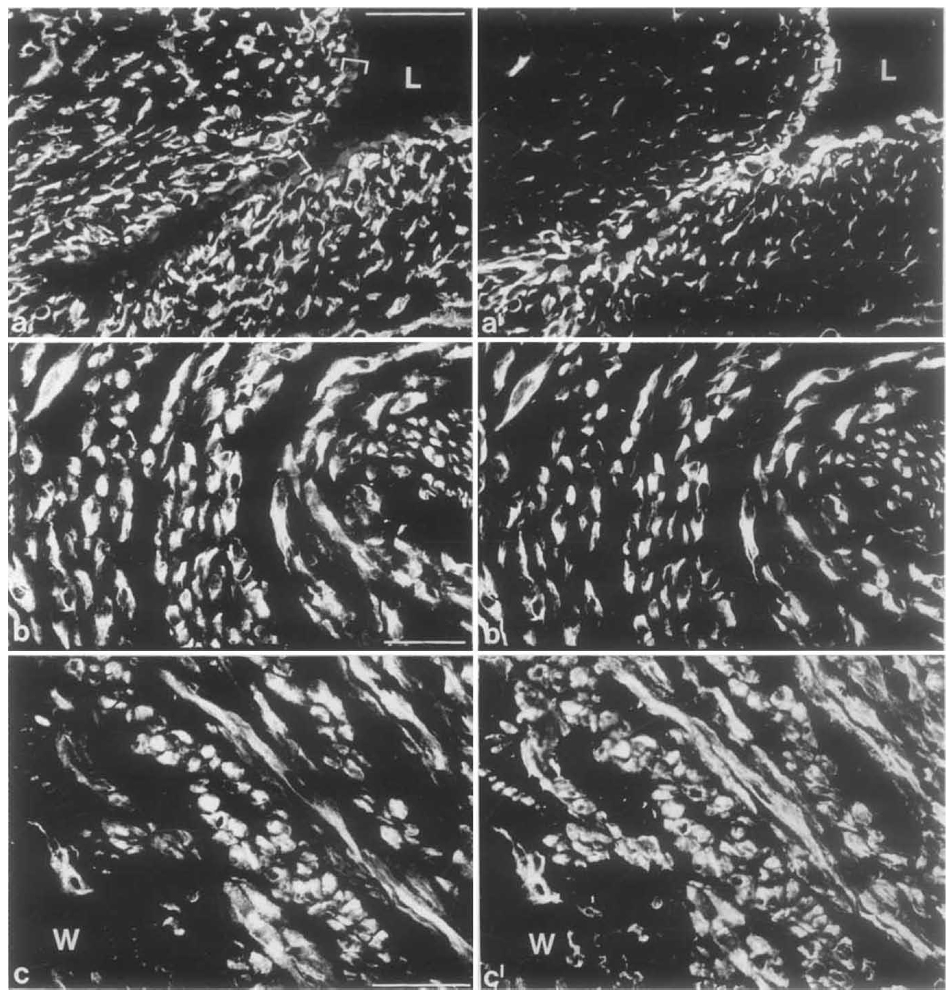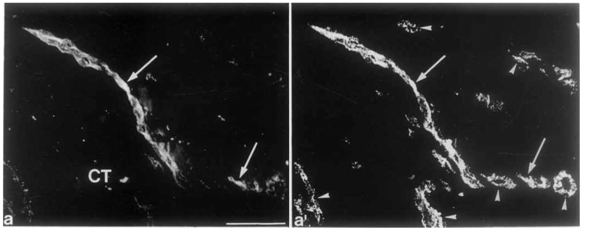 Fig. 8a, a’. Double-label-immunofluorescence microscopy of frozen section from human tongue submucosa, using cytokeratin antibody