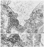region from the same tissue, showing a reaction with cytokeratin antibody lu-5. Three blood vessels display the moderate and heterogeneous
