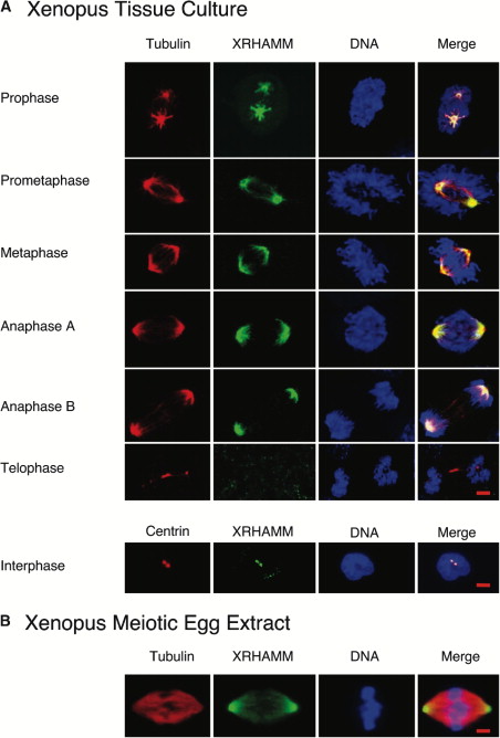 (A) The localizations of XRHAMM (green), tubulin (red), and DNA (blue) throughout the cell cycle in Xenopus XTC tissue cells. XRHAMM associates with microtubules during prophase and metaphase, with higher concentrations near the spindle pole. During anaphase, XRHAMM is undetectable in the spindle midzone, but during telophase, it is not on the mitotic spindle. During interphase, XRHAMM concentrates as puncta that colocalize with the centriole marker centrin, indicating that it localizes to the centrosome.
