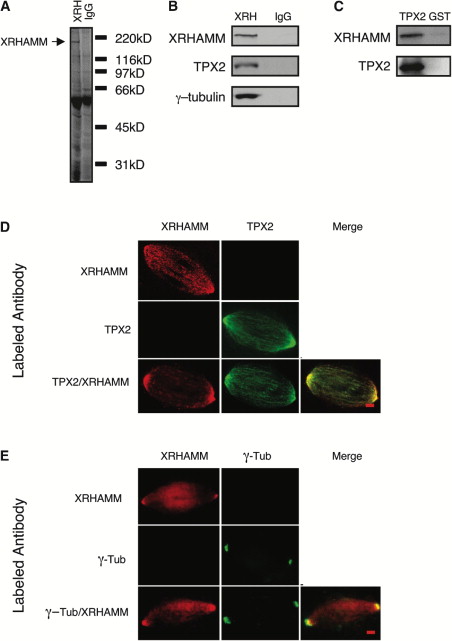 (D) The localizations of XRHAMM and TPX2 on unfixed Xenopus egg extract spindles. Note that XRHAMM and TPX2 colocalize predominantly at the spindle pole.