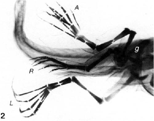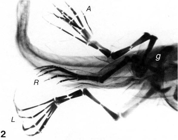 Fig. 2. Ventral view of the hindlimb region of a tadpole implanted with retinoic acid ion exchange beads at stage 50. The left developing hindlimb (L) is essentially normal as is the regenerated righthindlimb (R). The accessory limb (A) arises from an accessory pelvic girdle (g). In the accessory limb, the zeugopodium consists of three fused rods (tibia-fibula-tibia?) and the foot has seven somewhat irregular digits. x9.