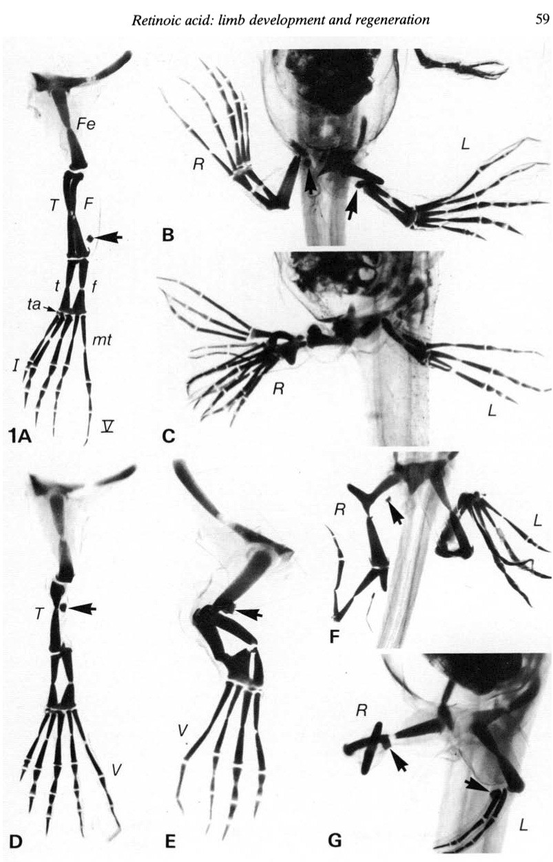 Fig. 1. (A) Lateral view of a lefthindlimb of a tadpole implanted with a control silastin block (arrowhead) at stage 52. Limb development was completely normal. The limb consisted of femur (Fe), fusing tibia (T) and fibula (F), tibiale (t) and fibulare ( / ) , five tarsals (ta) (of which only three are visible here), five metatarsals {mi), and 14 phalanges arranged on digits I through V in the formula 2-2-3-4-3. Digit V (V) is dorsal (on right in photomicrograph). x8. (B) Ventral view of the hindlimbs of a tadpole implanted with retinoic acid silastin blocks (arrowheads) at stage 52. In both the developing left (L) hindlimb and regenerating right (R) hindlimb, the femur and tibia-fibula were quite defective, and yet both feet were entirely normal. x8. (C) Ventral view of the hindlimbs of a tadpole implanted with retinoic acid silastin blocks at stage 52. The left (L) developing hindlimb lacked distalfemur, tibia-fibula, and proximal parts of tibiale and fibulare. Foot was moderately hypomorphic as well, with only three digits. The right (R) regenerating limb had a defective regenerate in which most of the leg was absent and yet the regenerated foot possessed 13 digits forming a ring as they emerge from an irregular set of tarsals. x8. (D) Lateral view of a lefthindlimb of a tadpole implanted with a retinoic acid silastin block at stage 53. The implant (arrowhead) came to lie in the region of the prospective fibula leading to the complete deletion of the element. The rest of the limb including the tibia (T) was apparently normal. Digit V (V) is dorsal. x9. (E) Lateral view of a regenerated righthindlimb of a tadpole implanted with a retinoic acid silastin block (arrowhead) at stage 54. The leg was quite defective with a shortened femur, and completely irregular tibia-fibula and tibiale-fibulare. The four-digithand was quite typical of regeneration subsequent to amputation at stage 54. Digit V (V) is dorsal. xl3. (F) Ventral view of the hindlimbs of a tadpole implanted with retinoic acid silastin blocks (arrowhead) at stage 52. In the developing left (L) hindlimb the femur, tibia-fibula, and tibiale-fibulare were largely fused into a continuous bent cartilage rod ending in a slightly hypomorphic four-digitfoot. The right (R) hindlimb regenerate was completely hypomorphic and ended in a single digit. x7. (G) Ventral view of the hindlimb of a tadpole implanted with retinoic acid silastin blocks at stage 53. The left (L) developing limb is greatly reduced with only two digits attached to the end of the femur. The right (R) regenerating limb has completely failed to regenerate. Only a V- shaped piece of cartilage is present beyond the femur and this probably represents a deformed stump tibia-fibula. xlO.