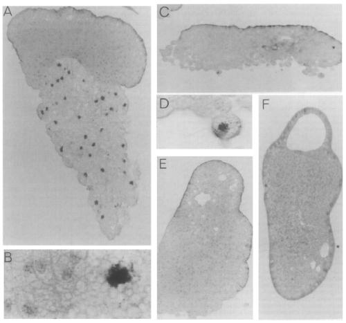 tissue. All figures are autoradiographs of sections. (A) A conjugate incubated until control stage 18. Nuclei of vegetal origin (large yolk platelets)