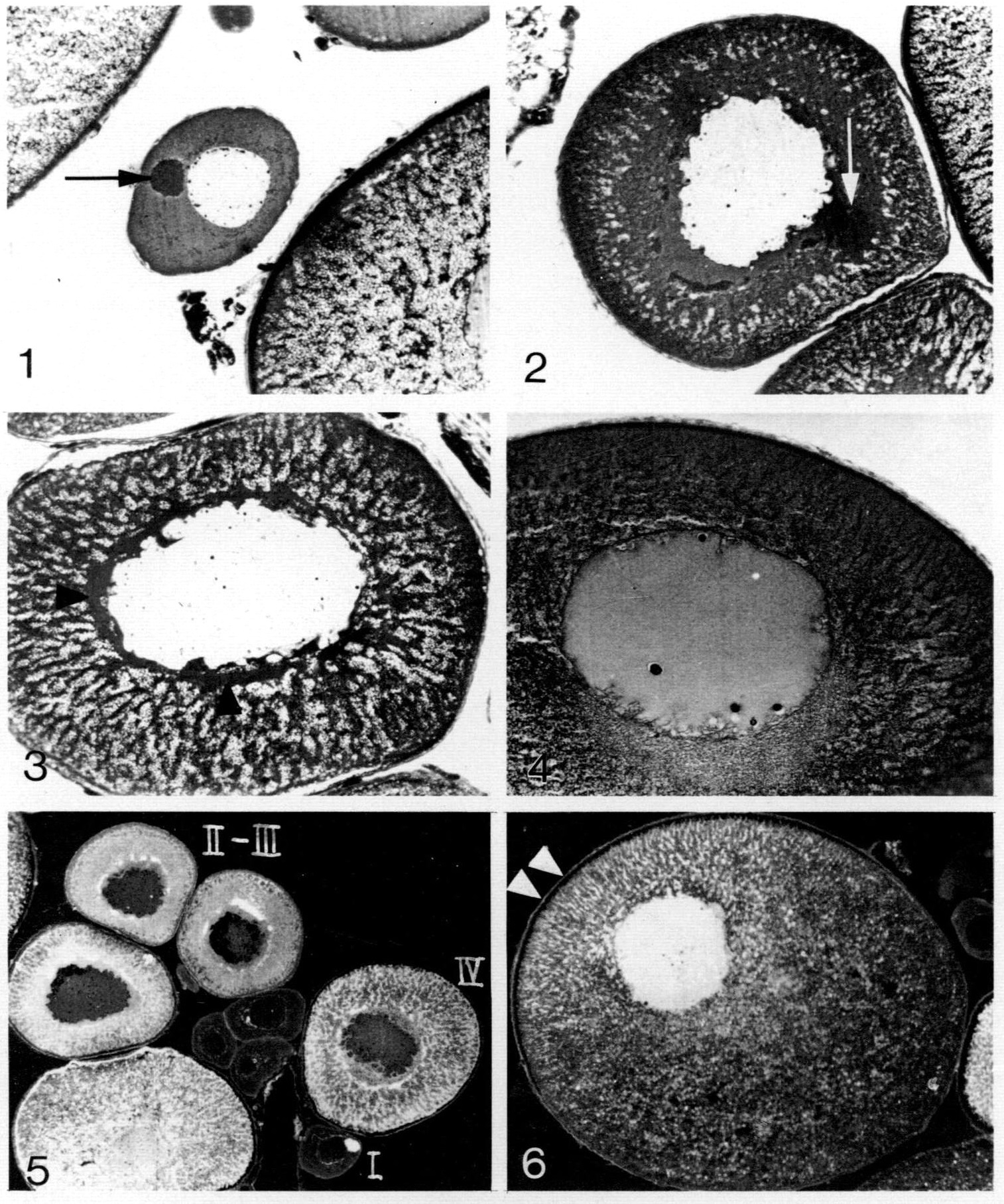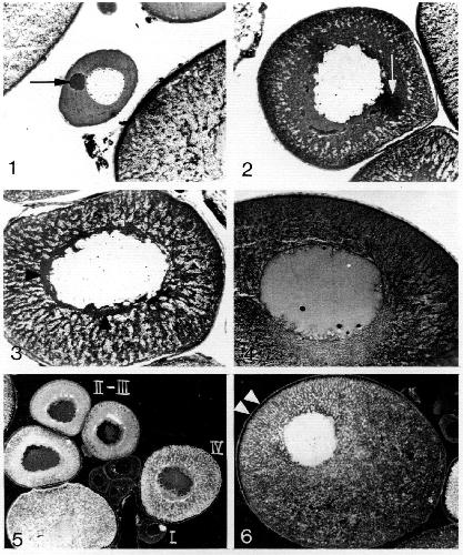 Figs. 1-4 Stage-I, -III, -IV and -VI oocytes. Aniline blue-orange G-azocarmine staining.