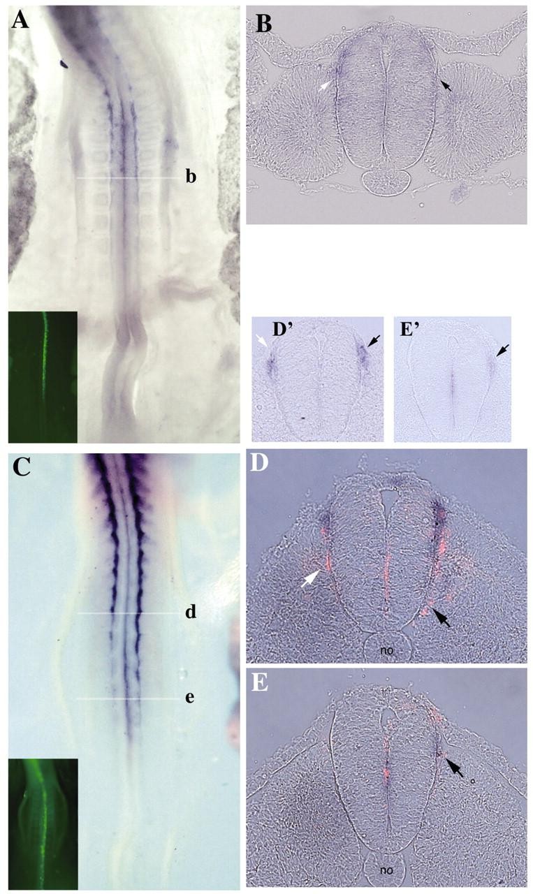 Fig. 5. Effect of elevated Cv-2 expression on trunk neural crest cell migration. (A-E) Representative images of the trunk region of stage 16 chick embryos electroporated with pCIG (A,B) or co-electroporated with pδCS2Cv-2 and pCIG (C-E) expression constructs at HH stage 10+. (A) In situ hybridisation with Sox10 of a control pCIG electroporated embryo. (B) Transverse section of embryo (A) at axial level indicated; black and white arrows identify equal progression of Sox10-positive migratory neural crest cells on control and electroporated sides. (C) In situ hybridisation with Sox10 of an embryo overexpressing Cv-2. The domain of Sox10 expression extends further caudally on the side overexpressing Cv-2 (right) than the control side (left). Insets in A and C show the distribution of GFP-positive cells, demonstrating the domain and efficacy of the electroporation prior to in situ hybridisation analysis; left side of the neural tube is the control; right side is the electroporated side. (D,E) Transverse sections through embryo (in C) as indicated by lines, with immunofluorescence labelling of HNK1. (Dâ²,Eâ²) Corresponding bright-field images in which the Sox10 signal is more easily seen. In the more anterior section (D,Dâ²) there is an increase in the number and distance of migration of HNK-1-positive migratory crest cells on the transfected side (black arrow) compared with the control side (white arrow). Sox10 signal is not detected in the ventralHNK1-expressing neural crest, perhaps owing to a decreased level of expression during ventral migration. In the more posterior section (E,Eâ²) Sox10- and HNK-1-positive crest cells have initiated migration on the Cv-2 electroporated side (black arrow) but not on the untreated side.