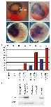 Fig. 4. Elevation of BMP4 activity by Cv-2. (A-D) Injection of Cv-2 (A), BMP4 (B) or BMP4 plus Cv-2 mRNA (C,D) with fluorescein dextran lineage tracer into a single animal pole blastomere at the 32-cell stage embryo, and Xbra expression detected at stage 10.5. Fluorescein dextran is detected in red, and Xbra in blue, with the normal expression domain around the blastopore lip indicated with a black ellipse. Ectopic BMP4 with or without Cv-2 induces ectopic expression of Xbra, either co-extensive with the normal expression around the blastopore lip (B,C) or as an isolated patch (D). (E) Summary of the effects of BMP4 and Cv-2 injections on the proportion of embryos with ectopic Xbra expression (%, y-axis). For each amount of BMP4 RNA, co-injection of Cv-2 RNA increases the induction of Xbra expression. The number of embryos analysed are indicated at the top of the chart. (F) Injection of BMP4 and/or Cv-2 mRNA at the one-cell stage embryo, followed by excision of animal caps at stage 8-9, and RT-PCR analysis of Xbra transcripts at stage 10.5. Quantitation with a phosphoimager reveals that Xbra expression is fourfold higher in BMP4 plus CV-2 injected animal caps than with BMP-4. Cv-2 alone does not induce Xbra expression.
