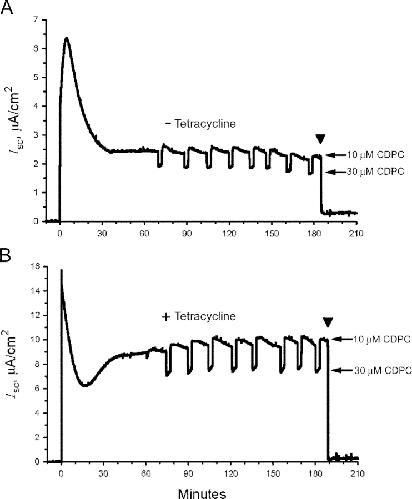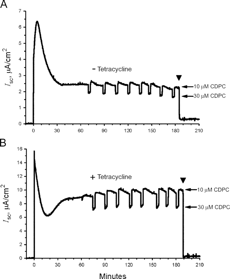 Figure 1. . Representative strip-chart recordings of the short-circuit current, Isc, in (A) nontreated and (B) tetracycline-stimulated cells. The apical perfusion solution contained 10 μM CDPC except for the pulse periods when the blocker concentration was increased to 30 μM (arrows). The marked inhibition of current by 100 μM amiloride at the end of the experiments (arrowhead) confirmed that the Isc mostly reflects ENaC mediated Na+ currents. The amiloride sensitive currents are also subtracted from the short-circuit currents to determine macroscopic rates of sodium transport expressed as blocker-sensitive Na+ currents (INa).