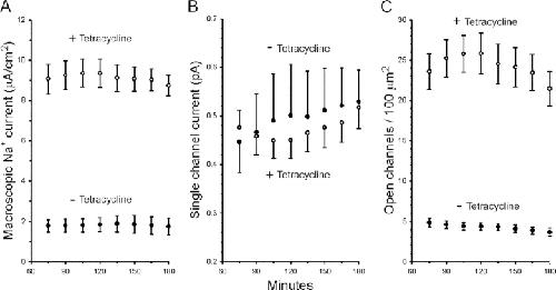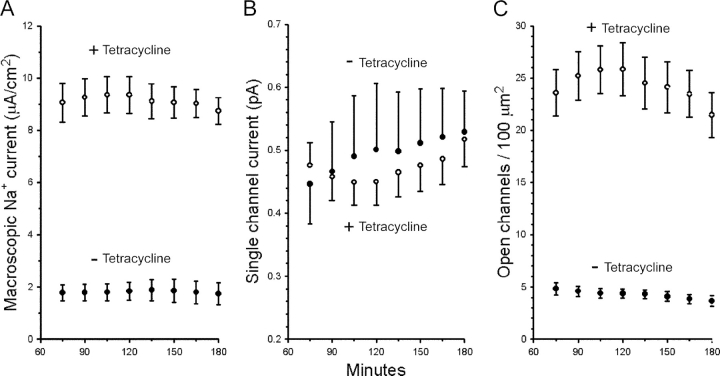 Figure 2. . Stimulation of Na+ transport in A6 epithelia by SGKTS425D expression. (A) Rates of Na+ transport measured as macroscopic Na+ currents (INa) are fivefold higher in tetracycline-treated cells (open circles) compared with nontreated cells (closed circles). (B) iNas do not change significantly with expression of SGKTS425D (+tetracycline). (C) The increase in Na+ transport in tetracycline-treated cells is due to a comparable increase in ENaC open channel densities (No). Values are means ± SE (n = 8 for nontreated cells, n = 9 for tetracycline-treated cells).