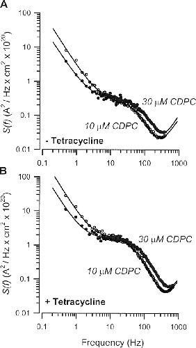 Figure 3. . Typical current noise PDS in control and SGKTS42 5 D expressing A6 cells. Current noise PDS at 10 μM (open circles) and 30 μM CDPC (solid circles) in (A) control and (B) tetracycline-treated cells. Data were fit by nonlinear regression to three components, including a Lorentzian {So/[1 + (f/fc)2]}, noise at low frequencies (S1/fα), and noise at higher frequencies (S2fβ), originating at the input stage of the voltage amplifier.