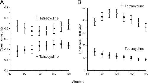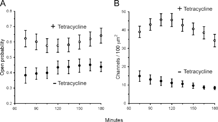 Figure 4. . SGKTS425D expression increases the number of active ENaCs and channel Po in A6 epithelia. (A) Expression of SGKTS425D (open circles, +tetracycline) increases Po by 43% above control cells (closed circles, âtetracycline). (B) NT, calculated as the quotient No/Po, increased by fourfold in cells expressing SGKTS425D (open circles, +tetracycline) compared with control cells (closed circles, âtetracycline). Values are means ± SE (n = 8 for nontreated cells, n = 9 for tetracycline-treated cells).