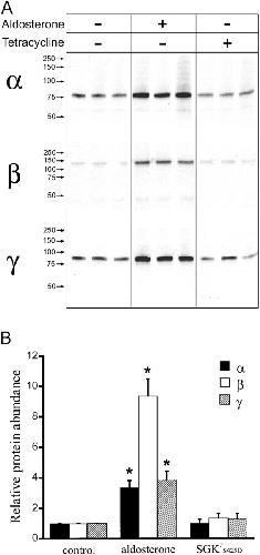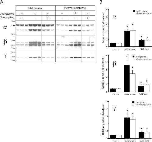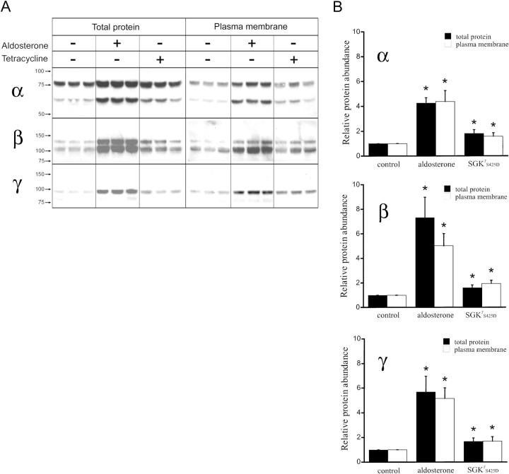 Figure 6. . Aldosterone and SGKTS425D effects on the relative abundance of xENaC subunits in A6 cells. (A) A6 cells grown on filters were treated overnight with 100 nM aldosterone or 1 μg/ml of tetracycline. Each condition was performed in triplicate. Apical plasma membrane proteins were biotinylated, recovered with streptavidinâagarose beads and analyzed by Western blot with antibodies against xENaC subunits (plasma membrane). Aliquots of cells lysates were run in parallel (total protein). Representative Western blots are shown for α, β, and γ ENaC subunits. Arrows indicate the migration of molecular mass standards. Molecular mass values are given in kD. (B) Quantification of relative changes in α, β, and γ ENaC subunit protein abundance. Bars represent mean ± SE of the values obtained in six to nine independent experiments, each of them performed in triplicate. Solid bars correspond to total protein and open bars to plasma membrane protein. Asterisks indicate statistically significant changes when compared with control conditions (P < 0.05).