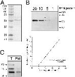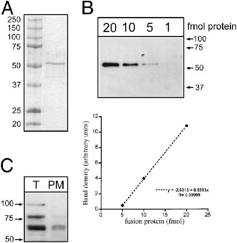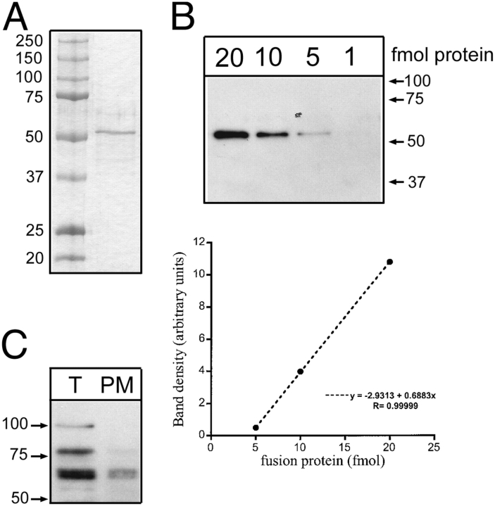 Figure 7. . Quantification of total and plasma membrane ENaC in A6 cells. We used cell surface biotinylation to obtain an estimate of the number of ENaCs endogenously expressed in the plasma membrane of A6 cells. (A) Coomassie blue staining of a SDS-PAGE with the product of MBP–αENaC fusion protein purification. Molecular mass (kD) of each of the standards is indicated on the left. (B) A serial dilution of the MBP–αENaC fusion protein was detected by Western blot with a polyclonal antibody against α subunit. Signal intensities were quantified with a densitometer and plotted against the amount of fusion protein in fmol. The signal was linear between 5 and 20 fmol. (C) Samples from total protein (T) and biotinylated plasma membrane proteins (PM) were loaded in the same gel used for the serial dilution of fusion protein.