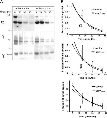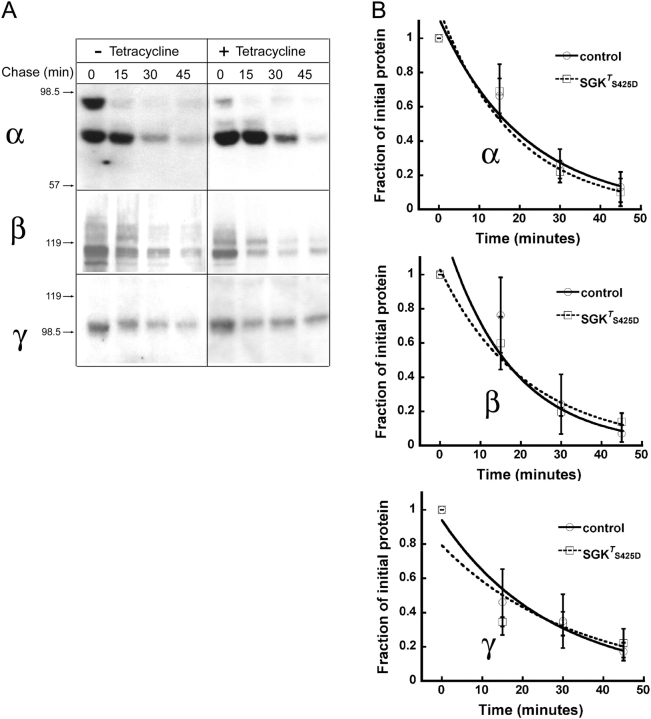 Figure 8. . xENaC subunits half-life in the plasma membrane. A6 cells were grown on filters, serum depleted, and treated overnight with 1 μg/ml of tetracycline. Apical membrane proteins were biotinylated at 4°C and then chased in serum-free medium for the indicated period of time (min). (A) Representative Western blots of biotinylated proteins recovered from the lysates of nontreated and tetracycline-treated cells and probed with antibodies against α, β, or γ xENaC subunits. The arrows on the left indicate migration of molecular mass markers (kD). (B) Time course of the decay in surface xENaC subunits. Data points are the mean ± SE of four to five independent experiments normalized to the values at time 0 fitted to a single exponential. There is no statistically significant difference between any of the data points in the two groups.