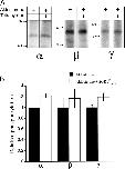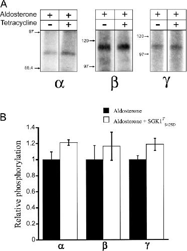Figure 10. . SGKTS425D effects on xENaC subunits phosphorylation. (A) A6 cells grown on filters were treated overnight with 100 nM aldosterone or 100 nM aldosterone and 1 μg/ml of tetracycline. Each condition was performed in triplicate. Cells were metabolically labeled with [32P]orthophosphate for 4 h in the presence of aldosterone or a combination of aldosterone and tetracycline and then lysed in the presence of phosphatase inhibitors. xENaC α, β, and γ subunits were recovered from the lysates by immunoprecipitation with specific polyclonal antibodies. The products of each immunoprecipitation were separated in SDS-PAGE and detected by autoradiography. Representative examples of α, β, and γ immunoprecipitation products for each condition are shown. Arrows indicate the migration of molecular mass markers (kD). (B) Quantification of relative changes in α, β, and γ ENaC subunit phosphorylation. Bars represent the mean ± SE of the values obtained from three samples normalized to those obtained from cells treated with aldosterone (solid bars). Open bars correspond to values obtained from cells treated with aldosterone and tetracycline.