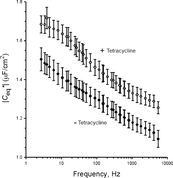 Figure 5. . Expression of SGKTS425D increases the absolute value of the |Ceq* | in A6 epithelia. Summary of the |Ceq*| at frequencies between 2.5 Hz and 5.5 kHz. Values are means ± SE for control (closed circles, n = 8) and tetracycline-treated (open circles, n = 7) A6 monolayers. For clarity, only every third point is shown. Induction of SGKTS425D expression caused a significant increase of cell capacitance at every frequency point.