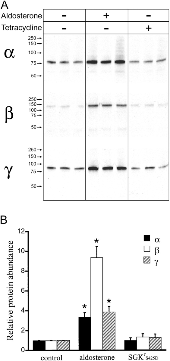 Figure 9. . Aldosterone and SGKTS425D effects on xENaC subunits rate of synthesis. (A) A6 cells grown on filters and serum depleted were treated overnight with 100 nM aldosterone or 1 μg/ml of tetracycline as indicated. Cells were metabolically labeled with [35S]methionine and [35S]cysteine for 15 min and lysed immediately afterwards. xENaC α, β, and γ subunits were recovered from the lysates by immunoprecipitation with specific polyclonal antibodies. The products of each immunoprecipitation were separated in SDS-PAGE and detected by autoradiography. A representative experiment performed in triplicate for each condition is shown. Arrows indicate the migration of molecular mass markers (kD). (B) Quantification of relative changes in α, β, and γ ENaC subunit rate of synthesis. Bars represent the mean ± SE of the values obtained in five independent experiments normalized to control conditions. Solid bars correspond to values for α subunit, open bars correspond to values for β subunit, and hatched bars correspond to values for γ subunit. Asterisks represent statistically significant changes when compared with control conditions. *, P < 0.01 compared with control.