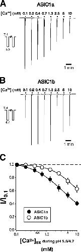 Dependence of the acid-sensitive ion channel, ASIC1a, on extracellular Ca(2+) ions.