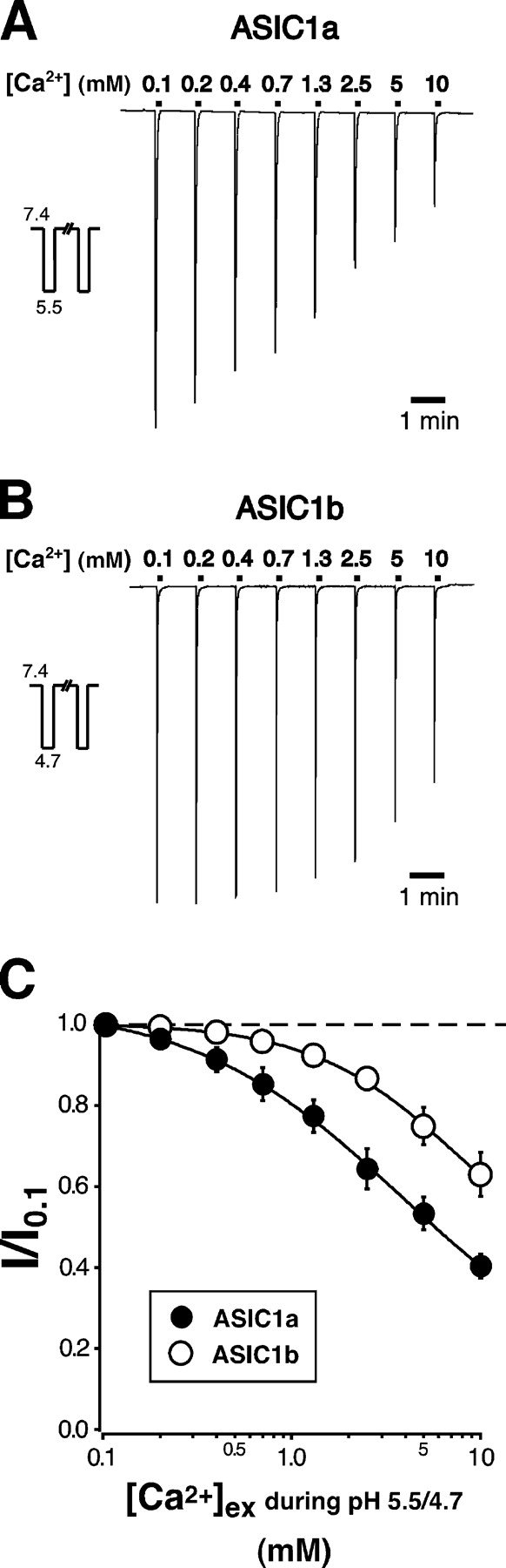 Figure 1. . Block by Ca2+ of ASIC1 expressed in Xenopus oocytes. (A) Block by Ca2+ of ASIC1a. Representative trace of ASIC1a currents elicited by application of pH 5.5 and varying concentrations of extracellular Ca2+. The trace was obtained from two original traces, one measured with increasing and one with decreasing Ca2+ concentrations. Both traces were normalized and then averaged to yield the trace shown. Acidic application solution was applied for 10 s and contained 140 mM NaCl and the indicated concentration of CaCl2. Neutral bath solution was applied for 1 min between channel activation and always contained 140 mM NaCl and 1.8 mM CaCl2. (B) Block by Ca2+ of ASIC1b. Representative trace of ASIC1b currents elicited by application of pH 4.7 and varying concentrations of extracellular Ca2+. The trace was obtained by averaging two traces as described in A. Duration of solution application and concentration of NaCl and CaCl2 as in A. (C) Dose–response relationship for inhibition by Ca2+. Lines represent a fit of the data to Eq. 1; the dotted line represents the maximal current, I = 1. IC50 was 3.92 ± 1.02 mM (n = 16) for ASIC1a and >10 mM (n = 8) for ASIC1b. Hill coefficient was 1.25 ± 0.16 and 3.48 ± 2.58, respectively. Note that block of ASIC1a is not complete with 10 mM Ca2+. Peak current amplitudes with 0.1 mM Ca2+ were 12.1 ± 1.6 μA for ASIC1a and 17.6 ± 4.4 μA for ASIC1b.