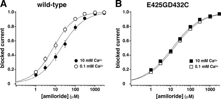 Figure 5. . Apparent affinity for amiloride of ASIC1a wild type but not of ASIC1a E425GD432C depends on Ca2+. (A) Dose–response relationship for inhibition of ASIC1a by amiloride in the presence of 0.1 mM Ca2+ (○) or 10 mM Ca2+ (•). Lines represent a fit of the data to Eq. 1. IC50 was 11.6 ± 2.4 μM (n = 15) in the presence of 0.1 mM Ca2+ and 33.3 ± 10.0 μM (n = 15) in the presence of 10 mM Ca2+; P < 0.05. Peak current amplitudes without amiloride were 14.8 ± 1.3 μA with 0.1 mM Ca2+ and 10.5 ± 1.7 μA with 10 mM Ca2+. Holding potential was −70 mV. (B) Dose–response relationship for inhibition of ASIC1a E425GD432C by amiloride in the presence of 0.1 mM Ca2+ (□) or 10 mM Ca2+ (▪). IC50 was 17.2 ± 3.7 μM (n = 14) in the presence of 0.1 mM Ca2+ and 18.4 ± 3.9 μM (n = 14) in the presence of 10 mM Ca2+; P = 0.99. Peak current amplitudes without amiloride were 8.1 ± 1.1 μA with 0.1 mM Ca2+ and 9.2 ± 1.5 μA with 10 mM Ca2+. Holding potential was −70 mV.