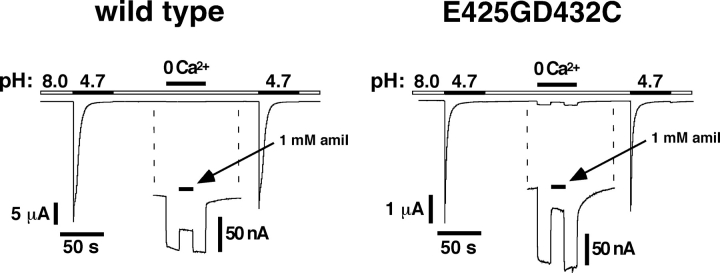 Figure 7. . Removal of extracellular Ca2+ opens ASIC1aE425GD432C. ASIC1a channels were first activated by pH 4.7. 60 s after recovery in pH 8.0, a solution containing no Ca2+ and no Mg2+, but 10 mM EDTA was applied; the concentration of Ca2+ in this solution should be in the low picomolar range. As can be seen from the blow-up, this divalent-free solution induced a small amiloride-sensitive current in ASIC1a wild type–expressing oocytes (left) as well as in E425GD432C-expressing oocytes (right). A similar response was seen in six independent oocytes for each condition. Solutions contained 0.2 mM flufenamic acid to block the large conductance induced in oocytes by divalent-free extracellular solutions.