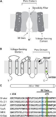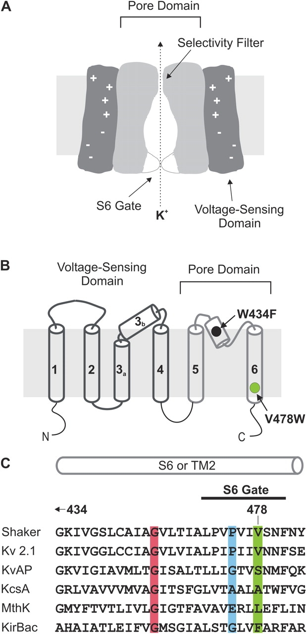 Figure 1. . The intracellular gate region of K+ channels. (A) Cartoon of a voltage-gated K+ channel showing separate voltage-sensing and pore domains and the S6 activation gate toward the intracellular side of the pore. (B) Membrane folding diagram for a Kv channel showing six TM domains. S1–S4 comprise the voltage-sensing domains, while S5–S6 forms the pore domain. Black circle in pore region illustrates the position of W434 and green circle in activation gate region illustrates the position of V478. (C) Sequence alignment between Kv channels, KcsA, MthK, and KirBac. Red highlighting marks the conserved Gly residue that is proposed to serve as the gating hinge (Jiang et al., 2002a,b). Blue highlighting marks the position of P475 in Shaker, corresponding to P406 in Kv2.1, G229 in KvAP, A108 in KcsA, E92 in MthK, and G143 in KirBac. Green highlighting marks positions equivalent to V478 in Shaker, where W substitutions result in nonconducting channels (Hackos et al., 2002).