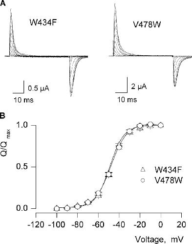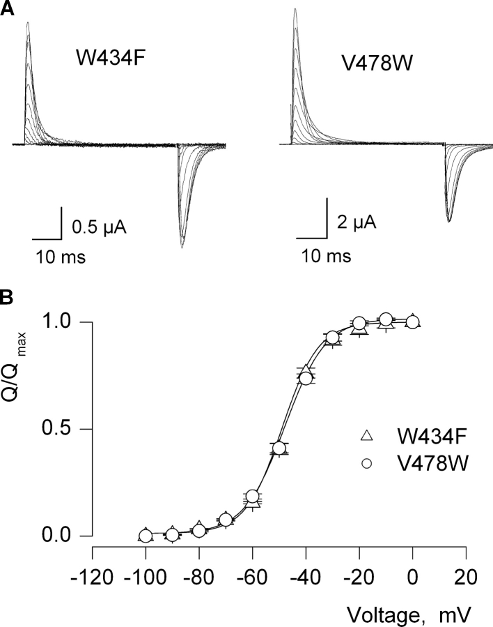 Figure 2. . Gating currents and Q–V relations for two Shaker Kv channel mutants that display a nonconducting phenotype. (A) Families of gating currents for two mutant Shaker K+ channels. For both families, holding voltage was −100 mV and depolarizations were to voltage between −100 mV and 0 mV with 10-mV increments. A P/−4 protocol was used to subtract leak and linear capacitive currents. (B) Normalized Q–V relations for W434F and V478W. Q was obtained by integrating both ON and OFF components of gating current, taking their average and normalized to Qmax measured at depolarized voltage. Data points are mean ± SEM. Smooth curves correspond to single Boltzmann functions with parameters as follows: W434F, V50 = −47.6 mV, z = 3.6; V478W, V50 = −47.3 mV, z = 3.2. See Table I for statistics.