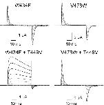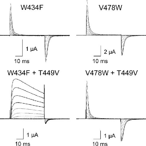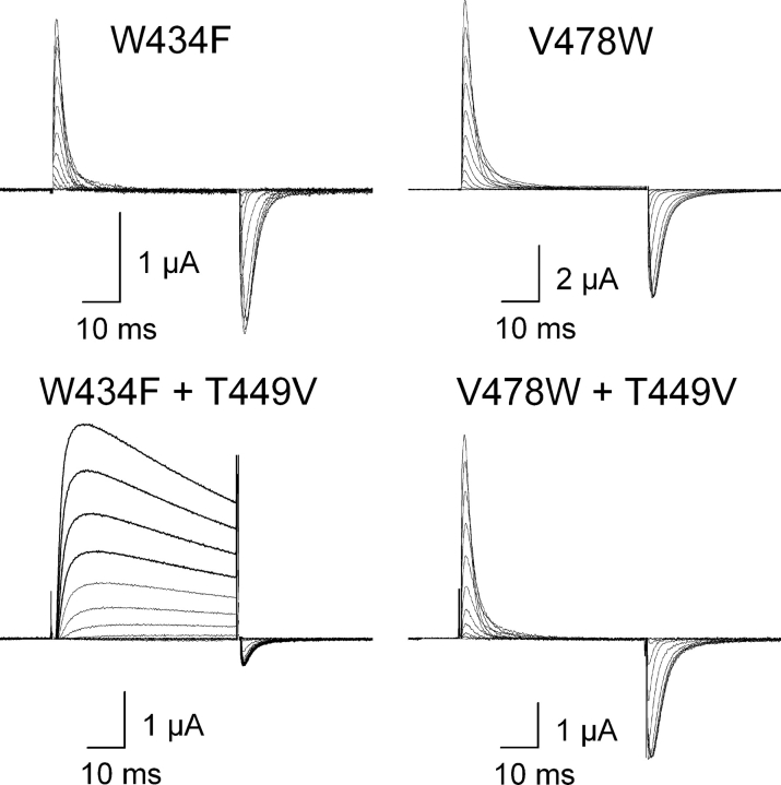Figure 3. . Effects of the T449V mutation on two nonconducting mutations in the Shaker Kv channel. Families of ionic and gating currents are shown for W434F and V478W, with and without the T449V mutation. For gating current families, holding voltage was −100 mV and depolarizations were from −100 to 0 mV, in 10-mV increments. For W434F+T449V, holding voltage was −100 mV, tail voltage was −100 mV, and depolarizations were from −100 to 40 mV, in 10-mV increments. A P/−4 protocol was used to subtract leak and linear capacitive currents.
