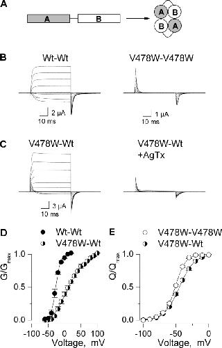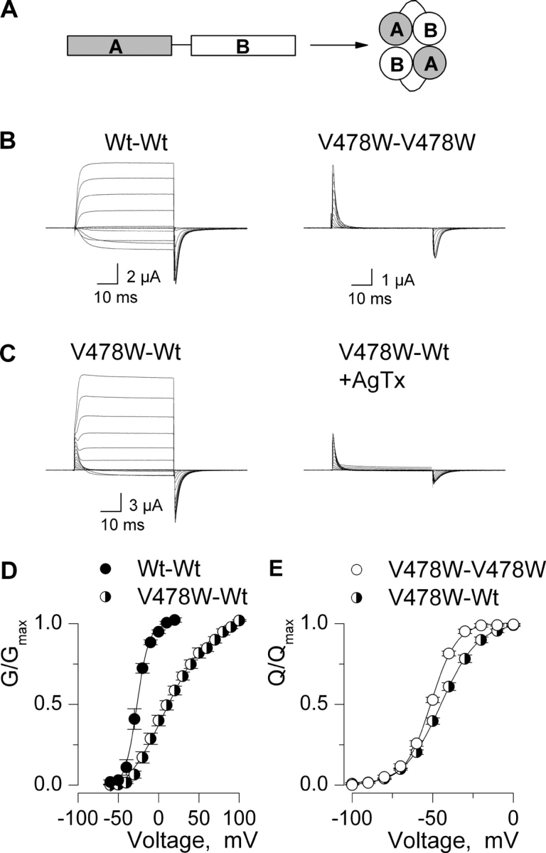 Figure 4. . Ionic and gating currents for dimeric Shaker constructs. (A) Schematic diagram illustrating dimeric channel constructs. A and B protomers are concatenated using 10-residue linkers. (B) Families of ionic and gating currents for homodimers of Wt and V478W-containing subunits. For Wt–Wt, holding voltage is −100 mV, tail voltage was −60 mV, and depolarizations were from −60 to 40 mV, in 10-mV increments. For V478W–V478W, holding voltage was −100 mV and depolarizations were from −100 to 0 mV, in 10-mV increments. (C) Families of ionic and gating currents for the V478W–Wt heterodimer. Holding voltage was −100 mV and depolarizations were from −100 to 50 mV, in 10-mV increments, with or without 1 μM Agitoxin-2. A P/−4 protocol was used to subtract leak and linear capacitive currents. All constructs were recorded using an external solution containing 100 mM KCl. (D) G–V relations for Wt–Wt and V478W–Wt dimers. For Wt–Wt, normalized tail current amplitudes, measured at voltages indicated in B, are plotted versus the voltage of the preceding depolarization. For V478W–Wt, the ionic tail currents are significantly contaminated by OFF gating current and therefore conductance was calculated from the amplitude of steady-state current before repolarization, normalized to the value at +100 mV and plotted versus voltage. Agitoxin-2 was used to isolate ionic currents from endogenous currents. Data points are mean ± SEM. Smooth curves are single Boltzmann fits to the data with parameters as follows: Wt–Wt, V50 = −27 mV, z = 3.4; V478W–Wt, V50 = +7 mV, z = 1. (E) Normalized Q–V relations for V478W–V478W and V478W–Wt dimers. Q was obtained by integrating both ON and OFF components of gating current, taking their average and normalized to Qmax measured following strong depolarizations. Data points are mean ± SEM. Smooth curves are single Boltzmann fits to the data with parameters as follows: V478W–V478W, V50 = −51 mV, z = 3.2; V478W–Wt, V50 = −45 mV, z = 2.2. See Table I for statistics.