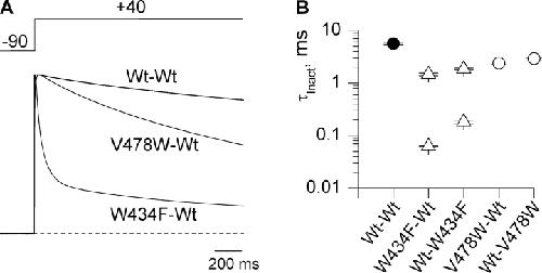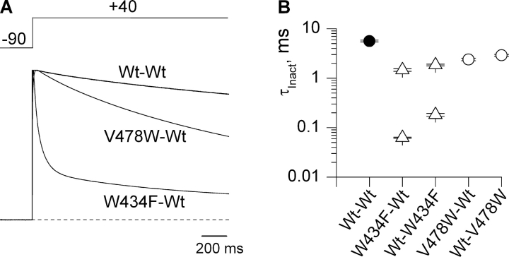 Figure 5. . Inactivation kinetics for W434F and V478W dimers. (A) Current records for long test pulses to +40 mV. All constructs were recorded using an external solution containing 100 mM KCl. (B) Inactivation time constants for dimer constructs. Single exponential functions were fit to inactivating currents for Wt–Wt (n = 12), V478W–Wt (n = 6), and Wt–V478W (n = 14), while double exponential functions were fit to inactivating currents for W434F–Wt (n = 10) and Wt–W434F (n = 12) dimers. Data points are mean ± SEM.