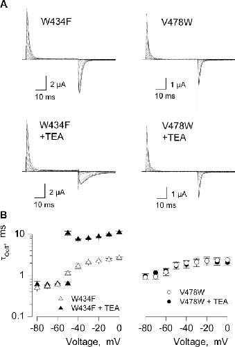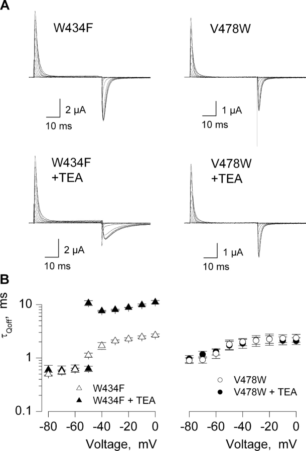 Figure 6. . Effects of internal TEA on gating charge immobilization in two Shaker Kv channel mutants. (A) Families of gating currents for two Shaker mutants in the absence and presence of internal TEA. For all mutants, holding voltage was −100 mV and depolarizations were from −100 to 0 mV, in 10-mV increments. A P/−4 protocol was used to subtract leak and linear capacitive currents. (B) Plots of τQoff against test voltage in the absence or presence of internal TEA. τQoff was obtained by fitting single exponential functions to the time course of OFF gating currents. For W434F in the presence of TEA, following test depolarizations to −50 mV, a double exponential function was fit to the OFF gating current. Data points are mean ± SEM. n = 3 for V478W and n = 4 for W434F.