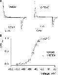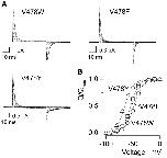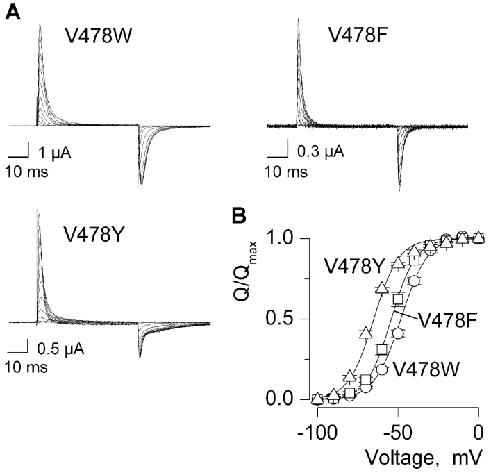 Figure 7. . Gating currents and Q–V relations for Shaker Kv channels with aromatic substitutions at V478. (A) Families of gating currents for three mutant Shaker Kv channels. For all families, holding voltage was −100 mV and depolarizations were to voltage between −100 mV and 0 mV with 10-mV increments. A P/−4 protocol was used to subtract leak and linear capacitive currents. (B) Normalized Q–V relations. Q was obtained by integrating both ON and OFF components of gating current, taking their average and normalized to Qmax measured following strong depolarizations. Smooth curves are single Boltzmann fits to the data with parameters as follows: V478W, V50 = −48 mV, z = 3.3; V478F, V50 = −54 mV, z = 3.3; V478Y, V50 = −66 mV, z = 2.9. See Table I for statistics.