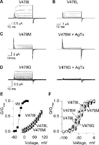 Figure 8. . Gating properties of Shaker V478 mutants displaying weakly conducting phenotypes. (A) Family of ionic and gating currents for the V478I mutant. Holding voltage was −100 mV and depolarizations were from −90 to 30 mV, in 10-mV increments. (B) Family of ionic and gating current for the V478L mutant. Holding voltage was −100 mV and depolarizations were from −90 to 80 mV, in 10-mV increments. (C) Families of ionic and gating current for the V478M mutant in the absence or presence of 1 μM Agitoxin-2. Holding voltage was −100 mV and depolarizations were from −100 to 100 mV, in 10-mV increments. (D) Family of ionic and gating current for the V478G mutant in the absence or presence of 1 μM Agitoxin-2. Holding voltage was −100 mV and depolarizations were from −100 to 100 mV, in 10-mV increments. (E) G–V relations for three weakly conducting mutants. Conductance was calculated from the amplitude of steady-state current before repolarization, normalized to Gmax estimated from Boltzmann fits and plotted versus voltage. Agitoxin-2 was used to isolate ionic currents from endogenous currents. Data points are mean ± SEM. Smooth curves are single Boltzmann fits to the data with parameters as follows: V478I, V50 = +88 mV, z = 1; V478L, V50 = +80 mV, z = 0.8; V478M, V50 = +89 mV, z = 1. (F) Normalized Q–V relations for three weakly conducting mutants. Q was obtained by integrating both ON and OFF components of gating current, taking their average and normalized to Qmax measured for strong depolarizations. Data points are mean ± SEM. Smooth curves are single Boltzmann fits to the data with parameters as follows: V478I, V50 = −56 mV, z = 2.8; V478L, V50 = −49 mV, z = 2.3; V478M, V50 = −41 mV, z = 2.1; V478G, V50 = −42 mV, z = 3.1; V478W, V50 = −48 mV, z = 3.3. In all instances a P/−4 protocol was used to subtract leak and linear capacitive currents. See Table I for statistics.