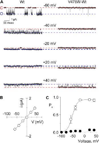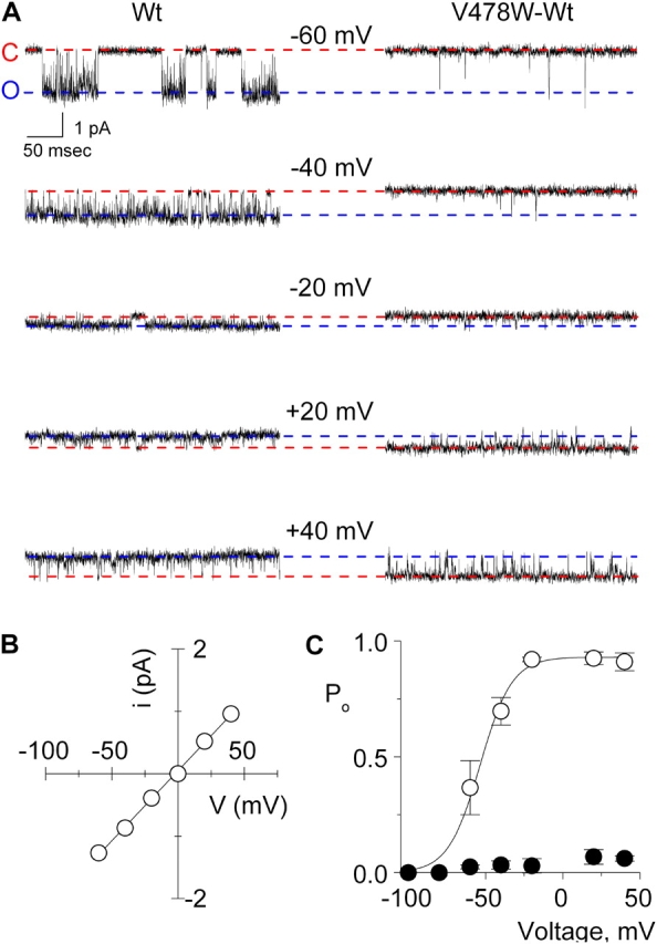 Figure 12. . Single channel properties of Wt Shaker and the V478W–Wt dimer channel recorded in symmetrical K+. (A) Representative current traces recorded from Wt Shaker (left) and V478W–Wt dimer (right) in symmetrical 140 mM KCl. The single channel patch was held at −100 mV and stepped from −100 mV to +40 mV with 20-mV increments for 400 ms and returned back to −100 mV. The traces represent segments of current records during the test pulse where single channel current events are observed. Filter frequency was 2 kHz. Horizontal dashed red and blue lines correspond to the closed and open current levels, respectively. (B) I–V relationship for the open state of the Wt Shaker channel. Linear regression of the shown data yields a conductance of 24 pS. (C) Open probability for the highest conducting state as a function of voltage for Wt (open circles) and for V478W–Wt dimer (filled circles). Smooth curve for Wt is a fit of a single Boltzmann function to the data with V50 = −54 mV and z = 2.5. Each data point represents the mean ± SEM (n = 5–6).