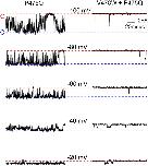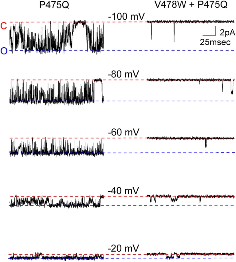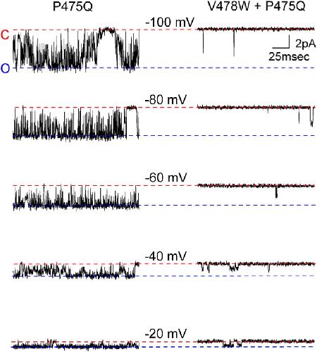 Figure 13. . Single channel properties of the Shaker P475Q and V478W+P475Q mutant channel. (A) Representative current traces recorded for P475Q (left) and V478W+P475Q (right) in symmetrical 140 mM KCl. The single channel patch was held at −100 mV and stepped from −100 mV to 0 mV with 20-mV increments for 400 ms and returned back to −100 mV. The traces represent segments from current records where single channel current events were observed. Filter frequency was 2 kHz. Horizontal dashed red and blue lines correspond to the closed and open current levels for single mutant, respectively.