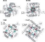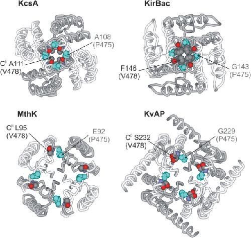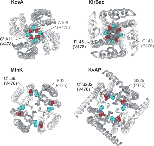 Figure 14. . Pore structures of four K+ channels viewed from an intracellular vantage point. In all instances, residues at the position equivalent to V478 are shown as CPK with carbon colored gray, oxygen colored red, and nitrogen colored blue. See Fig. 1 for sequence alignment. Residues at the equivalent position to P475 are shown in CPK with all atoms colored light blue. PDB accession code for KcsA is 1J95. PDB coordinates for KirBac provided by D.A. Doyle (University of Oxford, Oxford, UK). PDB accession code for MthK is 1LNQ. For MthK, E92 was modeled as an Ala. PDB accession code for KvAP is 1ORQ. Structures were generated using DS Viewer Pro (Accelrys).