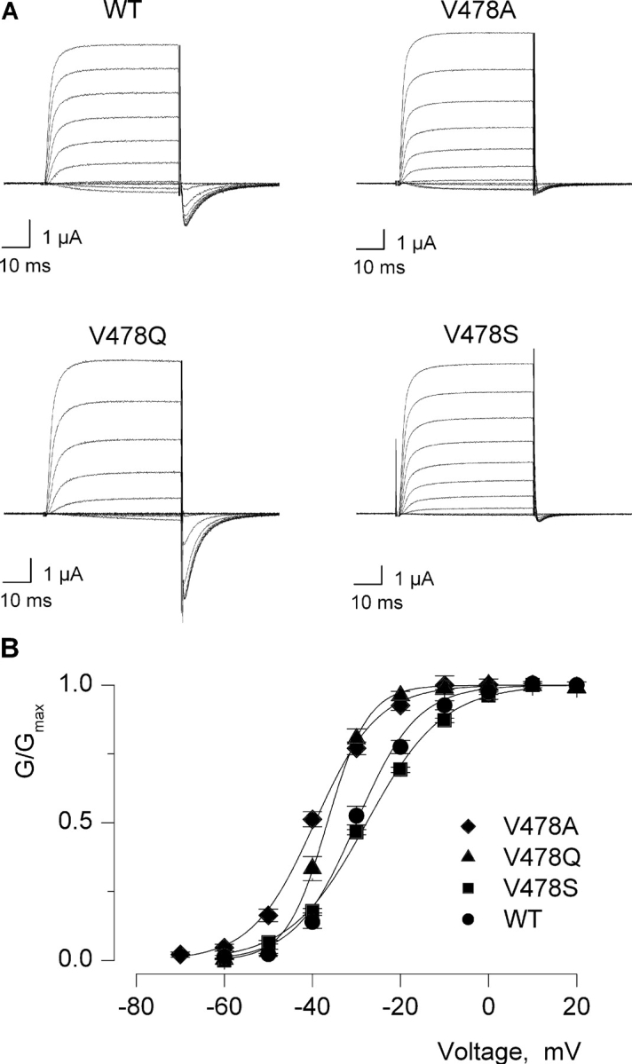 Figure 9. . Gating properties of Shaker V478 mutants displaying a normal conducting phenotype. (A) Families of ionic currents for Wt Shaker and three normal conducting mutants. For Wt and V478A, holding voltage was −100 mV, tail voltage was −60 mV, and depolarizations were from −60 to 40 mV, in 10-mV increments. For V478Q, holding voltage was −100 mV, tail voltage was −100 mV, and depolarizations were from −90 to 20 mV, in 10-mV increments. For V478S, holding voltage was −100 mV, tail voltage was −50 mV, and depolarizations were from −50 to 50 mV, in 10-mV increments. A P/−4 protocol was used to subtract leak and linear capacitive currents. (B) G–V relations for Wt Shaker and three normal conducting mutants. In all cases, normalized tail current amplitudes, measured at voltages indicated in A, are plotted versus the voltage of the preceding depolarization. Data points are mean ± SEM. Smooth curves are single Boltzmann fits to the data with parameters as follows: Wt, V50 = −30 mV, z = 3.8; V478A, V50 = −40 mV, z = 3.6; V478Q, V50 = −37 mV, z = 5.5; V478S, V50 = −28 mV, z = 3. See Table I for statistics.
