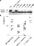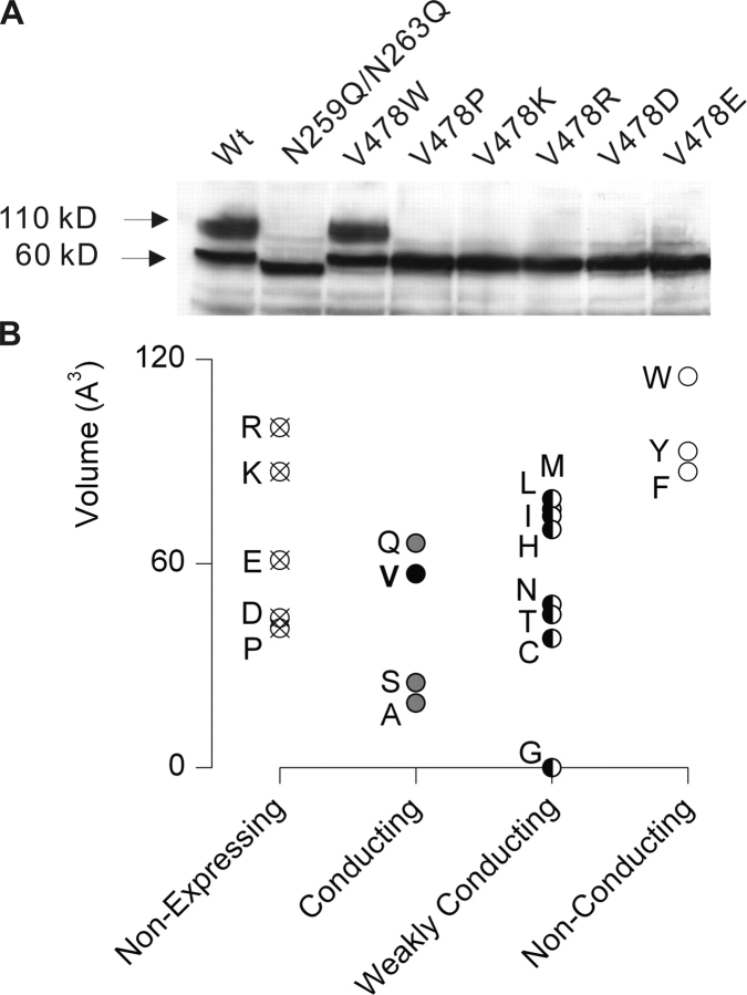 Figure 10. . Nonexpressing mutants of the Shaker Kv channel and summary of phenotypes resulting from substitutions at V478. (A) Western blot from SDS polyacrylamide gel of c-myc–tagged Shaker protein obtained from oocyte membrane preparations. Each lane contains three oocyte equivalents of Shaker protein. Wt protein has two dominant forms, a core-glycosylated species (band ∼70 kD) and a more heavily glycosylated mature form (band at ∼100 kD). The N259Q/N263Q double mutant shows only a single band at ∼65 kD and marks the position of the unglycosylated protein. (B) Summary of phenotypes resulting from different substitutions at V478.