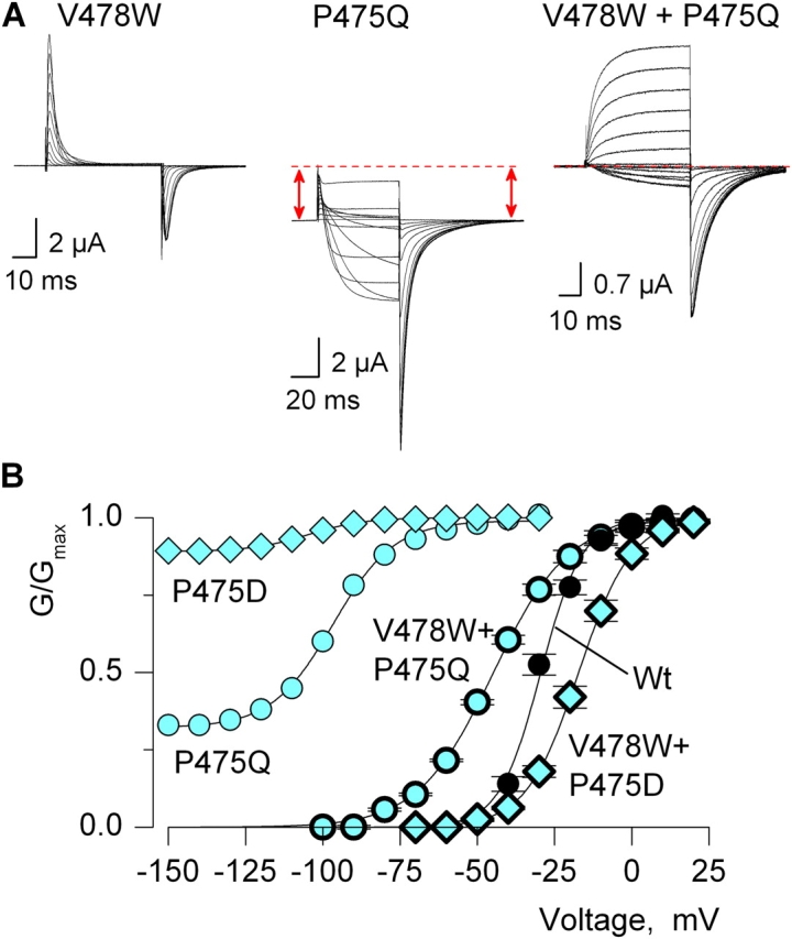 Figure 11. . Rescue of ion conduction in V478W by secondary mutations at P475. (A) Families of gating and ionic current for V478W, P475Q, and the double mutant. For V478W, holding voltage was −100 mV, depolarizations were from −100 to 0 mV (10-mV increments) and a P/−4 protocol was used to subtract leak and linear capacitive currents. For P475Q, holding and tail voltages were −150 mV and depolarizations were from −150 to 30 mV, in 10-mV increments. For V478W/P475Q, holding and tail voltages were −100 mV and depolarizations were from −90 to 40 mV, in 10-mV increments. For both P475Q and V478W/P475Q, leak and linear capacitive currents were identified and subtracted by blocking the Shaker channel with Agitoxin-2. (B) G–V relations for Wt, two P475 mutants displaying constitutive activity and two double mutants displaying normal voltage-dependent gating. Normalized tail current amplitudes are plotted versus the voltage of the preceding depolarization. For P475D, the external solution contained 50 mM KCl, whereas for all other constructs the external solution contained 50 mM RbCl. Data points are mean ± SEM. Smooth curves are single Boltzmann fits to the data with parameters as follow: Wt, V50 = −30 mV, z = 3.8; P475Q, V50 = −97 mV, z = 2.6; P475D, V50 = −105 mV, z = 2.8; V478W/P475Q, V50 = −45 mV, z = 2.1; V478W/P475D, V50 = −17 mV, z = 3. See Table I for statistics.
