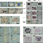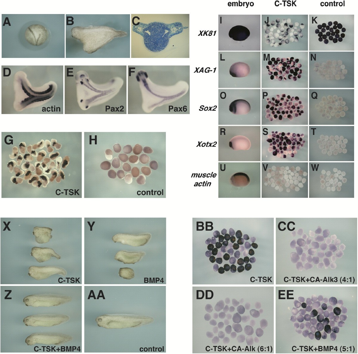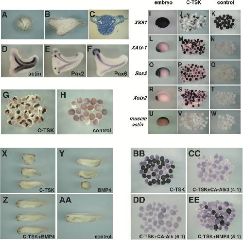 Fig.2. C-TSK Functions as a BMP Antagonist in Xenopus(AâF) C-TSK mRNA (400 pg) was injected into a ventral vegetal blastomere at the 8-cell stage and embryos were developed until stages 20 (A) and 31 (B). A transverse section (C) through the trunk region. In situ hybridization with actin (D), Pax2 (E), Pax6 (F) at stage 31.(G and H) VMZ explants injected with C-TSK were dissected at stage 10, cultured until stage 24, and subjected to in situ hybridization with muscle actin.(IâW) Animal cap assay.(I, L, O, R, and U) Marker expression in normal embryos at stage 21/22. Animal caps were prepared from stage 9 embryos that had been injected with 1.6 ng TSK (J, M, P, S, V) or control (K, N, Q, T, W). Animal caps were harvested at the time equivalent to stage 21/22 and hybridized with XK81 (IâK), XAG-1 (LâN), Sox2 (OâQ), Xotx2 (RâT), and actin (UâW) probes.(XâAA) Effect of C-TSK and BMP4 on dorsal-ventralization. After injection of the indicated constructs into 4 vegetal blastomeres at 8-cell stage, the effects on the D-V patterning were scored.(X) 1 ng of C-TSK (1 ng) per blastomere (DAI 6â7).(Y) 0.5 ng of BMP4 (DAI 0â3).(Z) 1 ng of C-TSK + 0.5 ng of BMP4 (DAI 4â5).(AA) 1 ng of C-TSK + 1 ng of BMP4 (DAI 0â2).(BB-EE) Effect of inhibition of BMP signal on TSK activity. After animal caps were prepared from stage 9 embryos that had been injected with 1.6 ng of C-TSK (BB), 3.2 ng of C-TSK + 0.8 ng of CA-Alk3 (CC), 4.8 ng of C-TSK + 0.8 ng of CA-Alk3 (DD), 2.5 ng of C-TSK + 0.5 ng of BMP4 (EE), expression of XAG-1 was analyzed.