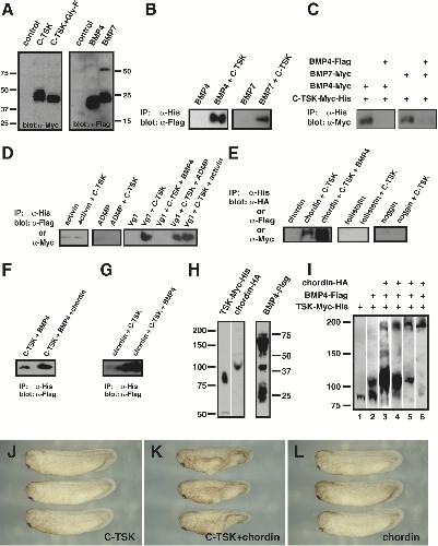 Fig.3. TSK Directly Binds to BMPs and Chordin(A) Western blot analysis of C-TSK-Myc-His, BMP4-Flag, and BMP7-Flag proteins used. C-TSK-Myc-His was treated with N-glycosidase F (lane 3).(B) Coimmunoprecipitation of C-TSK-Myc-His and BMP4-Flag or BMP7-Flag. After immunoprecipitation with nickel chelating resins, bound BMP-4 and BMP7 were detected by immunoblotting with anti-Flag antibody.(C) Competition assay. Coimmunoprecipitation of C-TSK-Myc-His and BMP4-Myc or BMP7-Myc in the presence or absence of BMP4-Flag.(D) Coimmunoprecipitation of C-TSK-Myc-His and activin-Flag, Vg1-Myc, or ADMP-Myc. After immunoprecipitation with His-tag, bound protein was detected by immunoblotting with anti-Flag or anti-Myc antibody.(E) Coimmunoprecipitation of C-TSK-Myc-His and chordin-HA, noggin-flag, or follistatin-Myc. After immunoprecipitation with His-tag, bound protein was detected by immunoblotting with anti-HA, anti-Flag, or anti-Myc antibody. Note that BMP4 enhances the binding between TSK and chordin.(F) The amount of BMP4 pulled down by C-TSK was increased in the presence of chordin. C-TSK-Myc-His was incubated with BMP4-Flag in the presence or absence of chordin. After immunoprecipitation with His-tag, bound BMP4-Flag was detected.(G) The amount of TSK pulled down by chordin was increased in the presence of BMP4. Chordin-Myc-His was incubated with C-TSK-Flag in the presence or absence of BMP4. After immunoprecipitation with His-tag, bound C-TSK was detected.(H) Synthetic mRNAs (1.2 ng of each RNA/embryo) encoding C-TSK-Myc-His, BMP4-Flag, or chordin-HA were injected into Xenopus embryos. Embryo extracts were subjected to SDS-PAGE under nonreducing conditions. Expression of proteins was analyzed by antibodies against their fused tags.(I) Synthetic mRNAs indicated in the figure were injected into all blastomeres of Xenopus embryos (lanes 1â5). TSK mRNA was injected in a blastomere while BMP4 and chordin mRNAs were injected another blastomere (lane 6). At stage 9, the embryos were treated with DTSSP and lysed. The embryo extracts were immunoprecipitated with an antibody against His tag and subjected to SDS-PAGE under nonreducing conditions. The blots were stained by the following antibodies: anti-Myc antibody (lanes 1â3), anti-FLAG antibody (lane 4), and anti-HA antibody (lanes 5 and 6).(JâL) Cooperative effect between C-TSK and chordin; 12.5 pg of C-TSK (J); 12.5 pg of C-TSK + 2.5 pg of Xenopus chordin (K); 2.5 pg of Xenopus chordin (L).