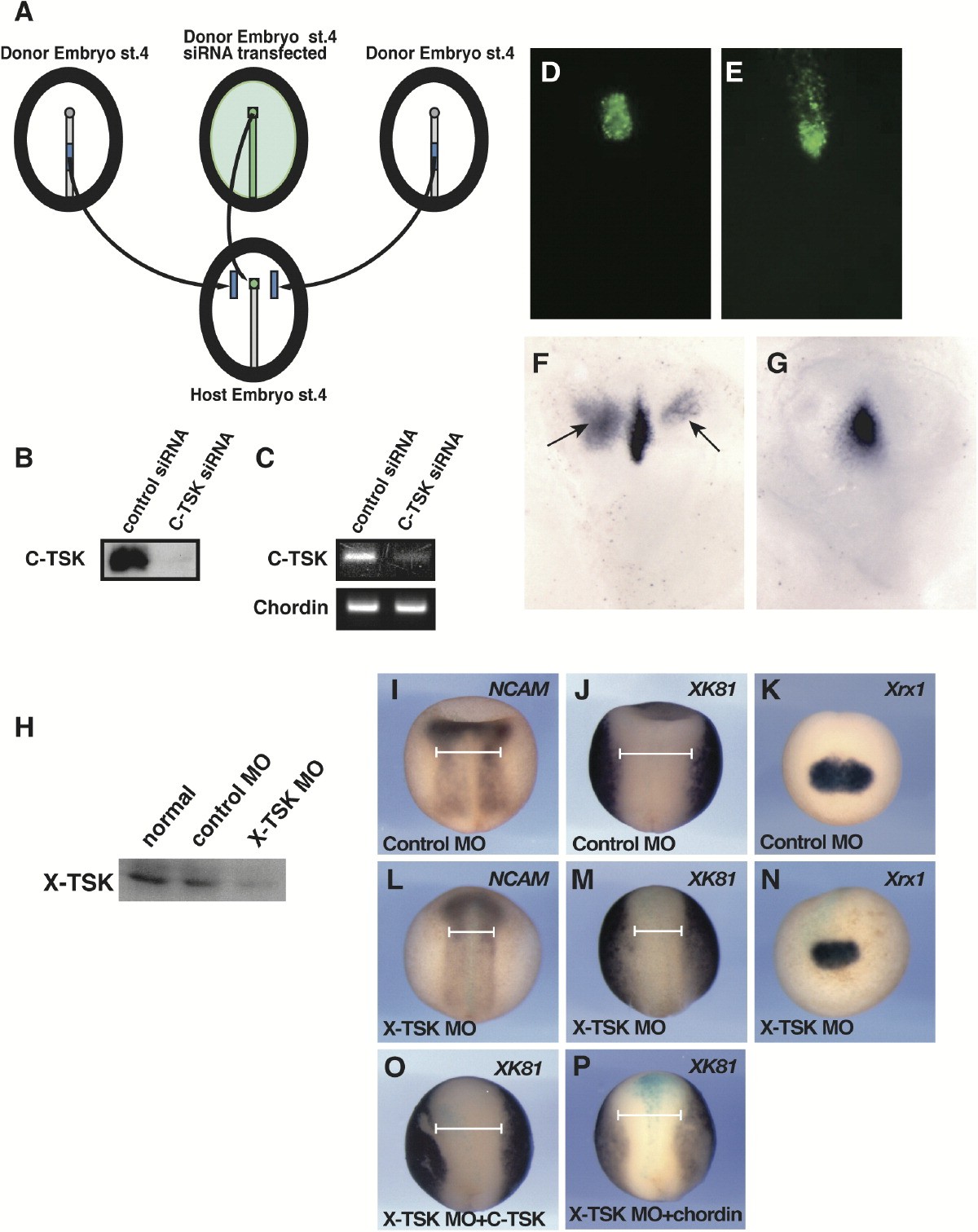 Fig.5. Gene Silencing of TSK Results in the Inhibition of Organizer Formation(A) Transplantation scheme of siRNA experiments. A chick embryo was electroporated with siRNA and Fluorescein Dextran at stage 4 and the excised node was implanted into the equivalent position of the host embryo. The middle primitive streaks from another two donor embryos were excised and grafted halfway between the node and the lateral edge of the area pellucida of the host embryo.(B) COS-7 cells were transfected either with control or C-TSK siRNA plus a C-TSK-Myc expression plasmid. The supernatants were blotted and level of C-TSK protein was assessed.(C) Hensen's node at stage 4 was electroporated either with control or C-TSK siRNA. After excision of the nodes, it was implanted into the equivalent position of the host embryos. After 6 hr incubation, the implanted nodes were excised, and the level of C-TSK or chordin mRNA was determined by RT-PCR.(D and E) Fluorescein-labeled cells in host embryos before (D) or after (E) incubation.(F and G) After the performance of experiments according to the scheme in (A), the ectopic induction of chordin was examined by in situ hybridization.(F) Control siRNA. In the case of control siRNA, the middle primitive streak induced ectopic expression of chordin in 8/18 (44%), which is similar to embryos without electroporation, 11/25 (44%).(G) C-TSK siRNA. In the case of C-TSK siRNA, the middle primitive streak induced ectopic expression of chordin in 6/24 (25%).(H) X-TSK MO reduces X-TSK protein level. X-TSK or control MO was coinjected with mRNA of Myc-tagged X-TSK containing 5â² UTR into animal blastomeres of Xenopus embryos. Animal caps were dissected at stage 8â9 and harvested after 3 hr incubation. The level of X-TSK protein was analyzed by Western blotting using an anti-Myc antibody.(IâP) X-TSK MO reduces the area of neuroectoderm with an associated increase of epidermis. After injection of 10 ng of the indicated morpholino, its effect on expression of NCAM, XK81, or Xrx1 was analyzed by in situ hybridization.(O) 240 pg of C-TSK mRNA was coinjected.(P) 120 pg of Xenopus chordin mRNA was coinjected. The width of neuroectoderm at the anterior side of trunk was indicated by white lines. X-TSK MO resulted in 34% reduction of the width of neuroectoderm. This reduction was largely rescued by C-TSK (86%) or Xenopus chordin (102%).