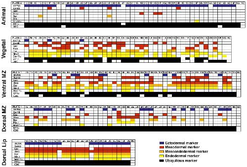 Fig. 3. Gene expression profiles of single cells at the early gastrula stage; cells express a combination of markers. Animal, vegetal, DMZ and