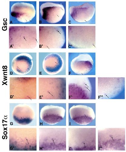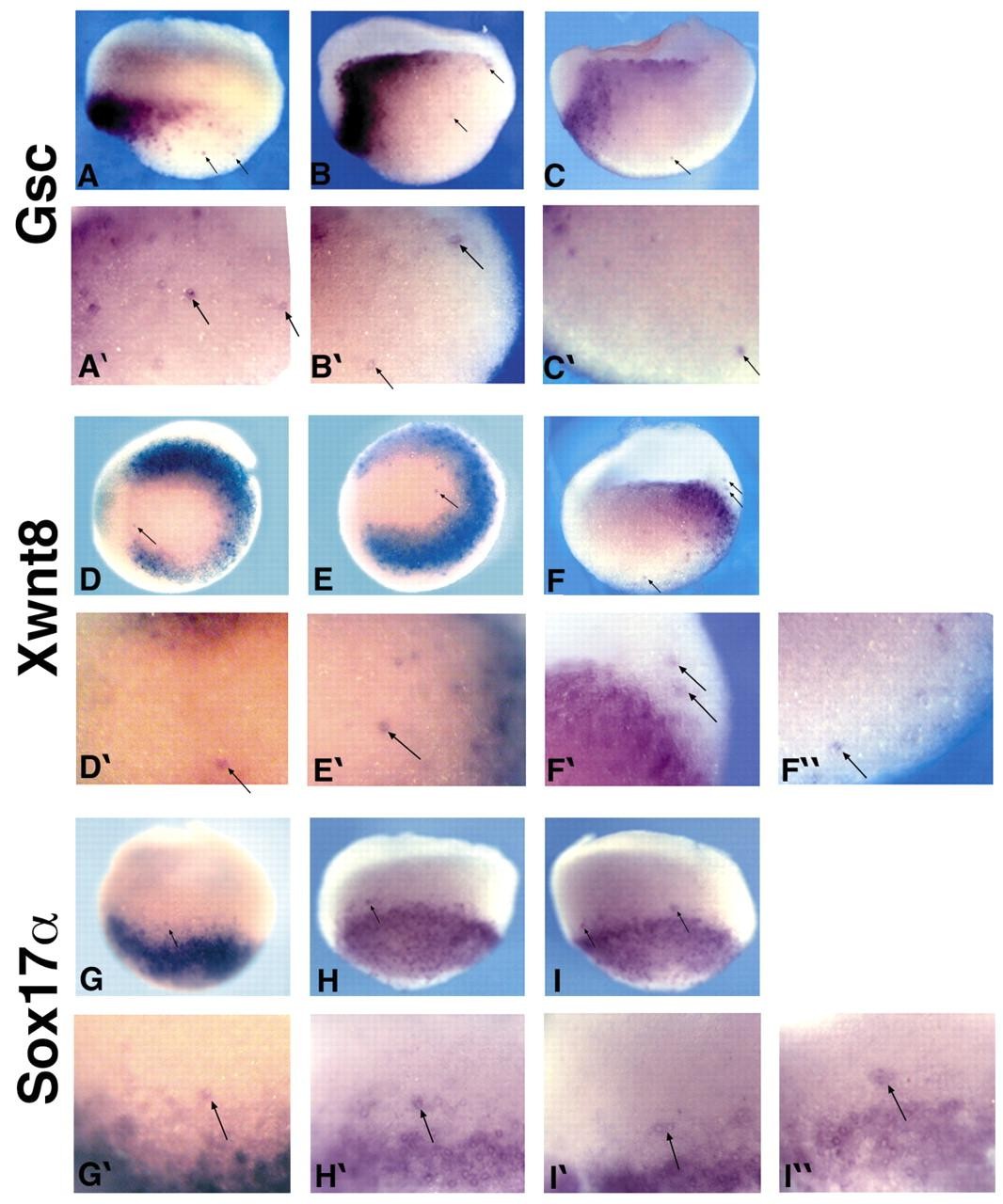 Fig. 1. Rogue cells express Gsc, Xwnt8 and Sox17α in the Xenopus early gastrula. In situ hybridization using Gsc, Xwnt8 or Sox17α antisense probes on bisected embryos at early gastrula stage 10-10.5. (A-C) The majority of Gsc expression is seen in dorsal mesendoderm; however, some expressing cells (arrows) are seen in the ventral marginal zone (Bâ²) and the vegetal mass (Aâ²-Câ²). (D-F) Xwnt8 expression is seen in the ventral marginal zone, although some expressing cells are seen in the dorsal marginal zone (Dâ²) and in the vegetal mass (Eâ²,Fâ²). (G-I) Sox17α expression is strongest in the vegetal mass; however, discontinuous expression is also seen in the marginal zone (Gâ²-Iâ²). Dorsal is towards the left, animal towards the top. (A,D,E,G,H,I) The outside surface of embryo; (B,C,F) the cut surface of embryo. (Aâ²-Iâ²) Higher magnification of the cells indicated in A-I.